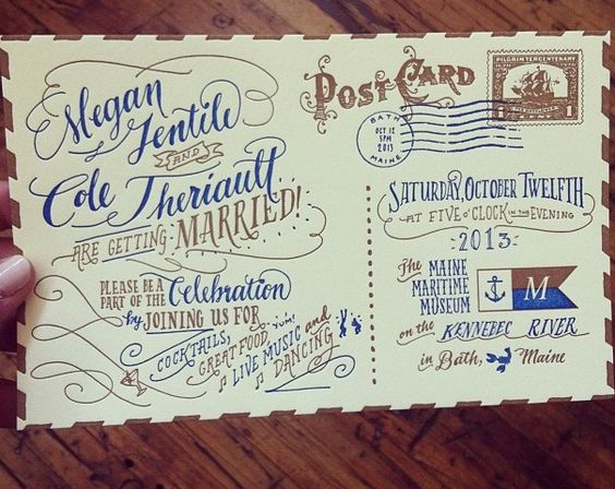 Create an invite that no one can pass up on with postcards! We love the calligraphy style writing and vintage shades, both of which are a popular choice for wedding stationery right now. This couple have chosen a style to match their venue, the Maine Maritime Museum. This clever use of design to convey the theme and venue all at once is utterly swoon-worthy. We’d definitely pin this to our fridge for safe keeping!