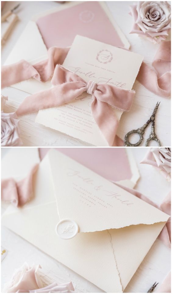 If you’re going for a classic style wedding, topping your invite with a bow or ribbon is a great option for adding a finishing touch. We love this gorgeous pink velvet bow used in the example above. By matching the dusty rose colour of the font to the bow, it ties the entire design together.