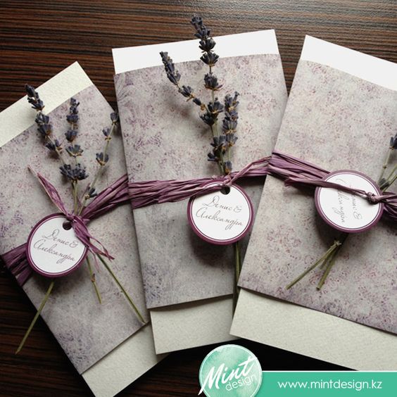 We love this extremely pretty wedding invite hack. It takes already-gorgeous textured invites and adds an extra element of dried lavender to create a dainty, whimsical look that’s indicative of the style of wedding. All tied together with some purple paper and a tag with the couple’s name on.