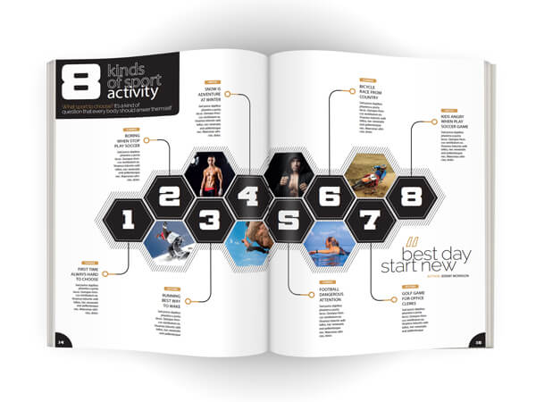 Using colour to define sections within your book can make for an eye catching read. We love bright and colourful design ideas like this! Why not try using block colours with white text to make a statement? That way your content will still be easy to digest even though you’ve got all those awesome colours.