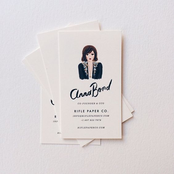 Like all external communications, your business card should reflect your brand and resonate with your target market just as much as a banner or an email. If you’ve already created your company’s brand guideline, you’ll know exactly what colours to use, the fonts, the logo, the style of artwork – everything! The business card design below shows an illustration of Anna Bond, CEO of stationery and lifestyle brand Rifle Paper Co. This style is very indicative of the Rifle Paper website and it also shows personality and creativity without compromising Bond’s professionalism.