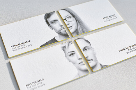 Depending on your industry, showcasing your service with photographs is a fantastic way to demonstrate what you’ve got to offer. This works particularly well for businesses who offer a visual service, such as wedding planners and hair salon business cards. If you get it right, adding a photo of yourself is a great way of making sure you’re remembered – especially after networking events where potential customers and clients will have received countless business cards and met loads of different people! A Finnish design company, bananas, create a modern twist on headshot business cards by only showing part of the business card owner’s face. This stops it from being too corny while the brand is still recognisable.
