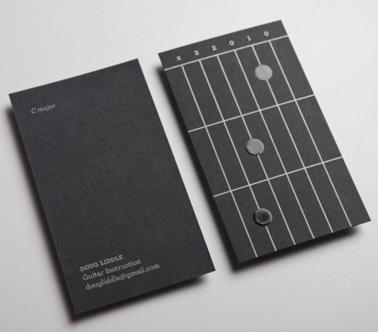 Humour related to your industry is a great way of adding some personality to your unique business card design without losing focus of your goals – just like the example below! This extremely clever design tip for a guitar instruction business card uses spot UV on top of a guitar-string diagram to indicate finger placement for a C major chord, which is one of the first chords a beginner would learn. It’s fun, it’s related to the industry and it’s really memorable; we love it.