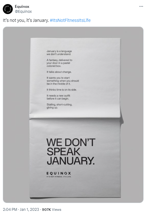 New York based luxury gym group, Equinox ran a campaign which banned people from joining as a new member on 1st January 2023. Taking to both Twitter/X and TikTok, the brand explicitly said “WE DON’T SPEAK JANUARY” and wrote a message branding New Year's Resolutions as fantasies.