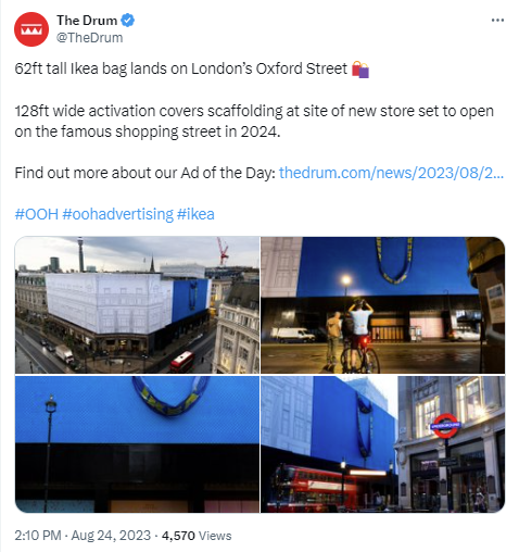 IKEA are well known for their unconventional marketing ideas, and in 2023, the press and social media users went wild for their 128ft wide scaffolding cover which was designed to look exactly like the recognisable IKEA carrier bag. This was made to bring excitement to the new IKEA store opening on Oxford Street, which is one of the most exciting retail areas in the UK.