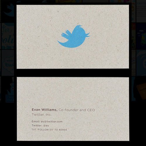 Below is Twitter CEO Evan Williams’ business card. It's a very minimal, business card design featuring important contact information on one side and the business’ logo (Larry the Bird) on the other. The logo is what really stands out here, especially in the recognisable blue Twitter brand colour. If you’re struggling to design a memorable logo for your start-up logo, check out this blog for some awesome tips!