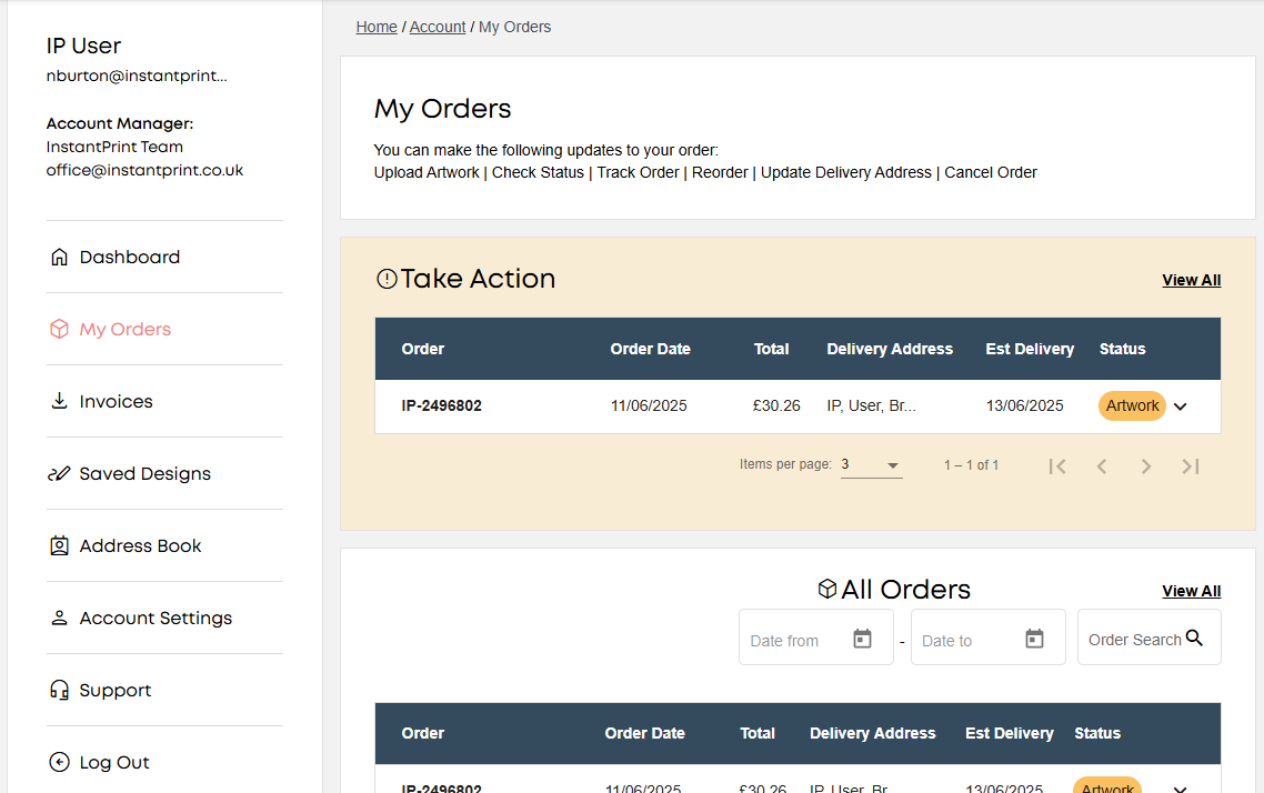 You’ll see a list of your recent orders. If your artwork’s still missing, we’ll flag it with an Action Required alert.